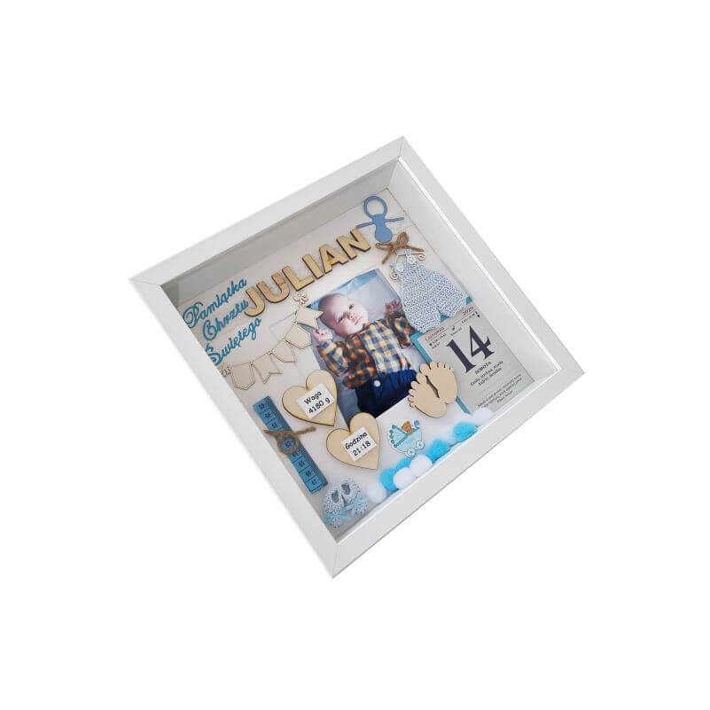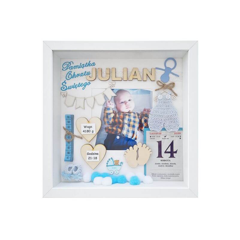 Metryczka na Chrzest Święty to wyjątkowa pamiątka na całe życie dla dziecka oraz rodziców. Idealny pomysł na prezent oraz oryginalna i niepowtarzalna ozdoba pokoju dziecięcego. Ręcznie wykonana, oprawiona w białej ramie z dekorami w efekcie 3D. Do postawienia lub powieszenia na ścianie. Kolorystyka i dodatki dobrane do płci dziecka. Zastosowane dekory wykonane są z wysokogatunkowych materiałów: drewna, papieru, tkanin i innych.
