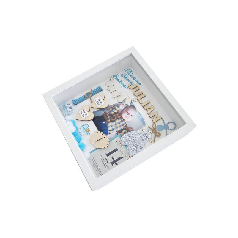 Oferowany wzór dotyczy metryczki 3D na chrzest dla chłopca ze zdjęciem w rozmiarze 27×27 cm. Ramka zdobiona między innymi takimi elementami jak:
