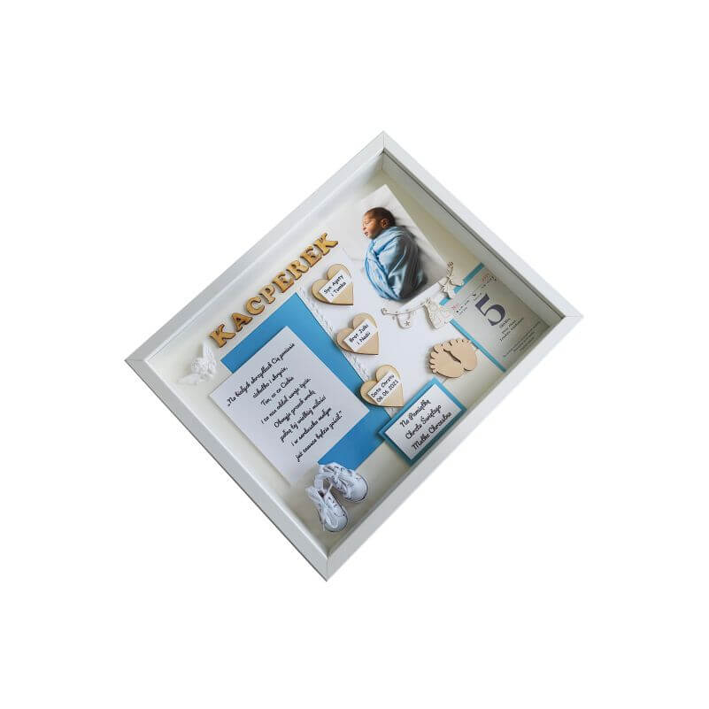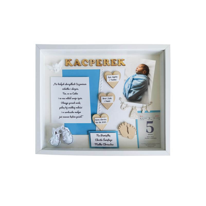 Metryczka na Chrzest Święty to wyjątkowa pamiątka na całe życie dla dziecka oraz rodziców. Idealny pomysł na prezent oraz oryginalna i niepowtarzalna ozdoba pokoju dziecięcego. Ręcznie wykonana, oprawiona w białej ramie z dekorami w efekcie 3D. Do postawienia lub powieszenia na ścianie. Kolorystyka i dodatki dobrane do płci dziecka. Zastosowane dekory wykonane są z wysokogatunkowych materiałów: drewna, papieru, tkanin i innych.