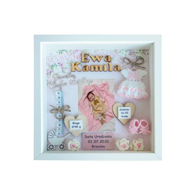 Personalizowana, ręcznie wykonana metryczka dla dziewczynki ze zdjęciem z okazji Chrztu Świętego w formie ramki 3D w rozmiarze 25×25 cm. Wzór dostępny także w rozmiarach: 27×27 cm, 30×30 cm.