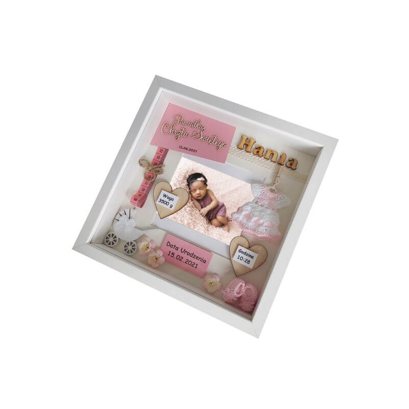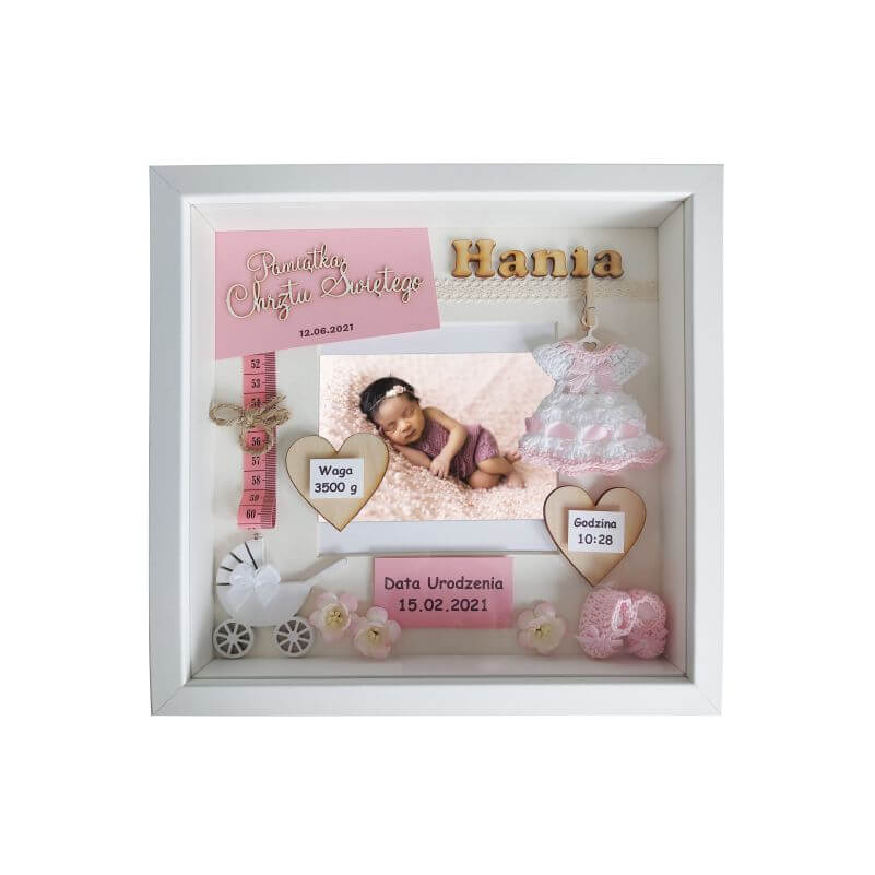 Przy zamówieniu należy podać podstawowe dane dziecka do umieszczenia widniejące w oferowanym wzorze m.in. imię, datę urodzenia, datę chrztu, wagę, wielkość, godzinę narodzin , miejscowość i inne. Każda ramka jest unikatowa i oryginalna dlatego na etapie zamówienia istnieje możliwość modyfikacji dodatków i umieszczenia innych, dodatkowych informacji takich jak np. imiona rodziców, imiona rodzeństwa, pierwszy uśmiech, pierwsze kroki, pierwszy ząbek, cytat, miejscowość, znak zodiaku i wiele innych.