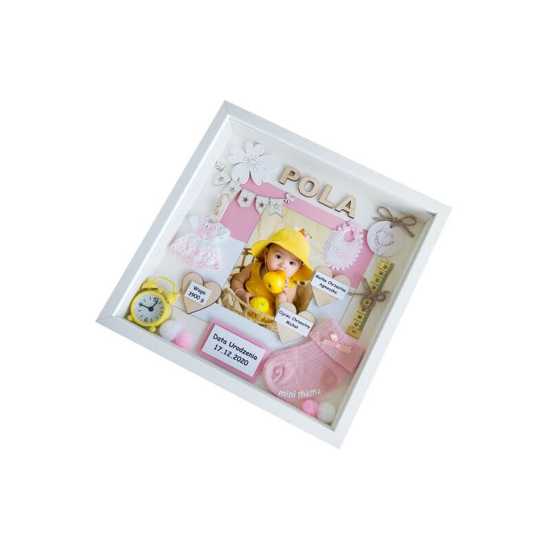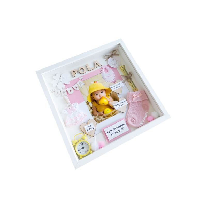 Personalizowana, ręcznie wykonana metryczka dla dziewczynki ze zdjęciem z okazji Chrztu Świetego w formie ramki 3D w rozmiarze 30×30 cm. Wzór dostępny także w rozmiarach: 27×27 cm, 30×37 cm.