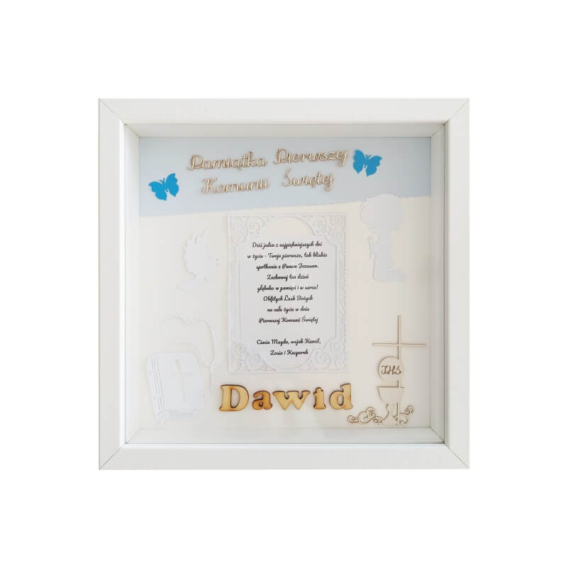 Metryczka na Komunię Świętą to wyjątkowa pamiątka na całe życie dla dziecka oraz rodziców. Idealny pomysł na prezent oraz oryginalna i niepowtarzalna ozdoba wnętrz. Ręcznie wykonana, oprawiona w białej ramie z dekorami komunijnymi w efekcie 3D. Do postawienia lub powieszenia na ścianie. Kolorystyka i dodatki dobrane do płci dziecka.