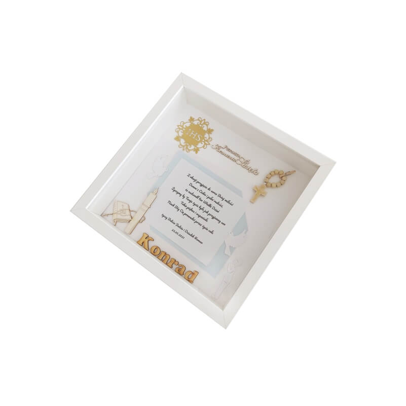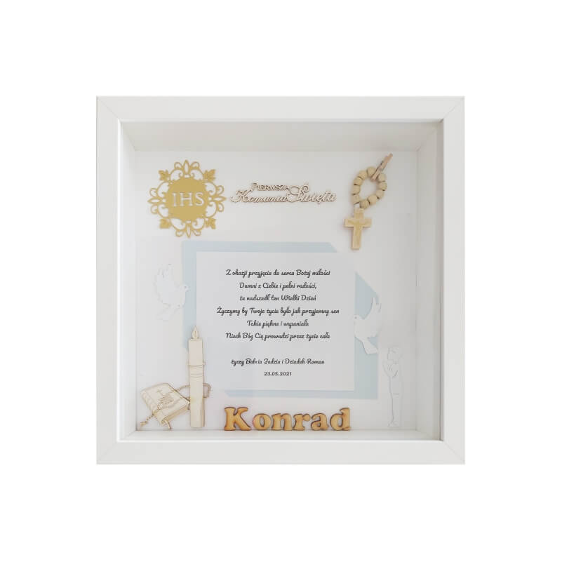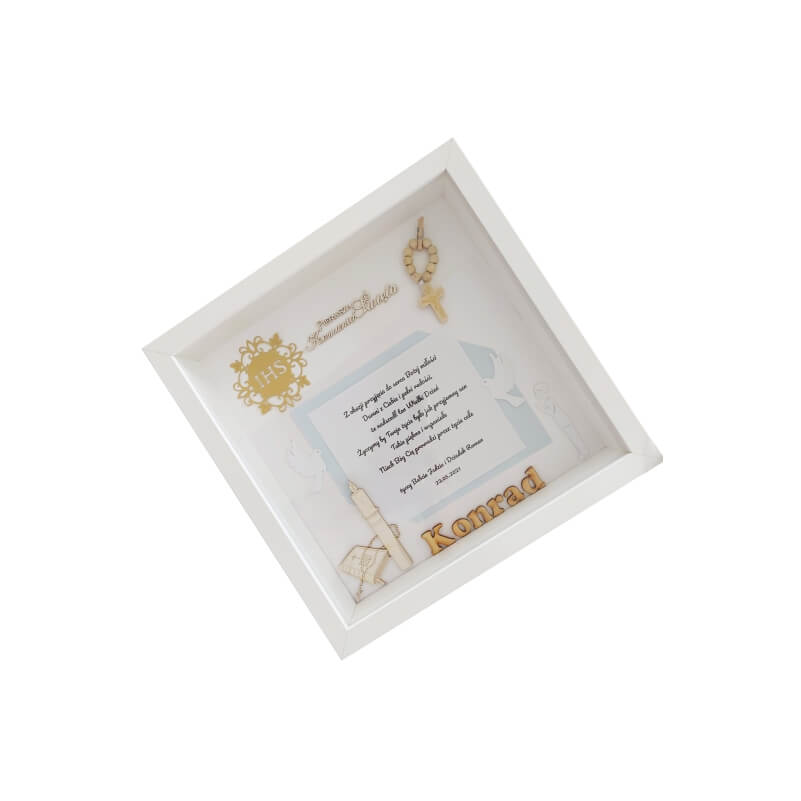 Oferowany wzór dotyczy metryczki 3D na komunię dla chłopca bez zdjęcia w rozmiarze 27×27 cm. Ramka zdobiona między innymi takimi elementami jak: