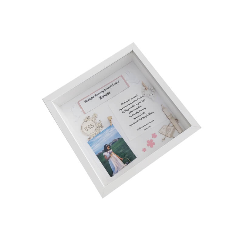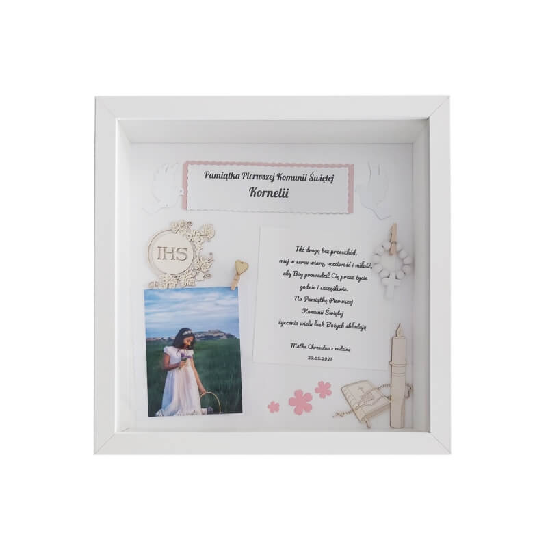 Personalizowana, ręcznie wykonana metryczka dla dziewczynki ze zdjęciem z okazji Komunii Świętej w formie ramki 3D w rozmiarze 27×27 cm. W ramce umieszczone są personalizowane życzenia, dedykacja oraz zdjęcie (lub pozostawiamy miejsce do samodzielnego wklejenia zdjęcia komunijnego). Wzór dostępny także w rozmiarach: 25×25 cm.