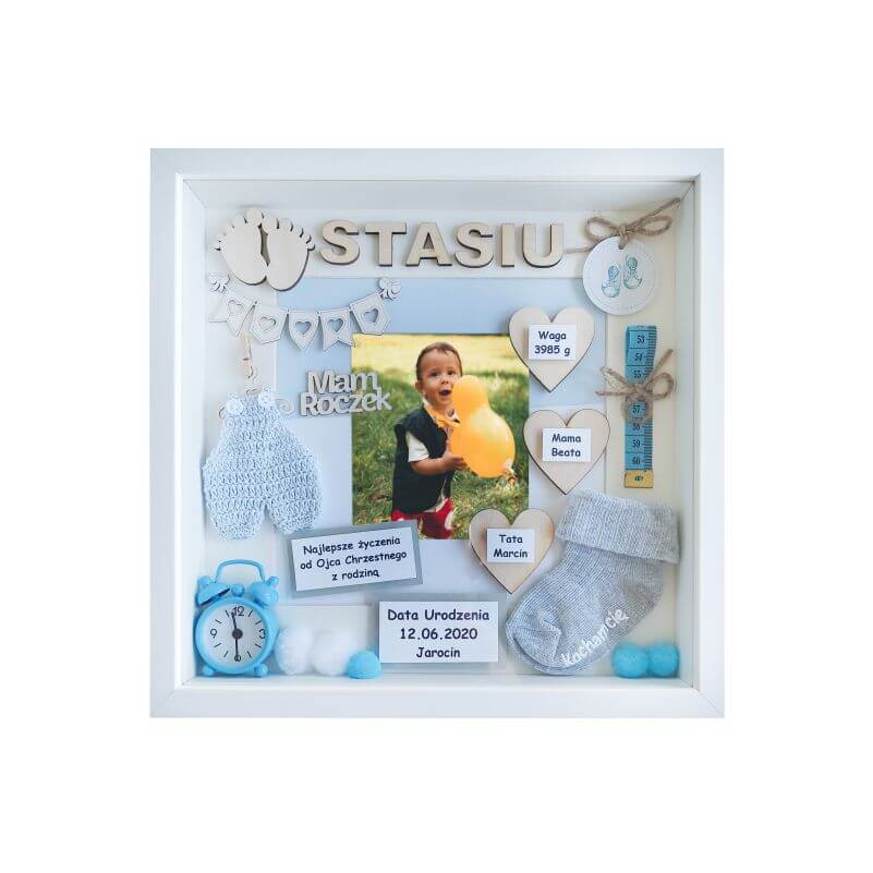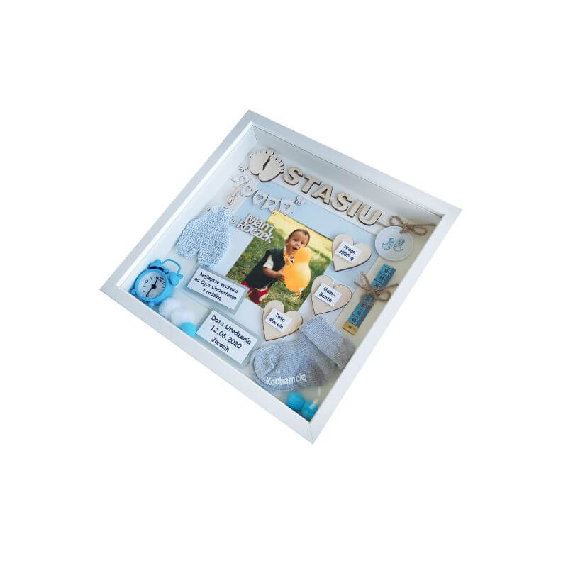 Oferowany wzór dotyczy metryczki 3D na roczek dla chłopca ze zdjęciem w rozmiarze 30×30 cm ze szklaną osłoną. Ramka zdobiona między innymi takimi elementami jak: