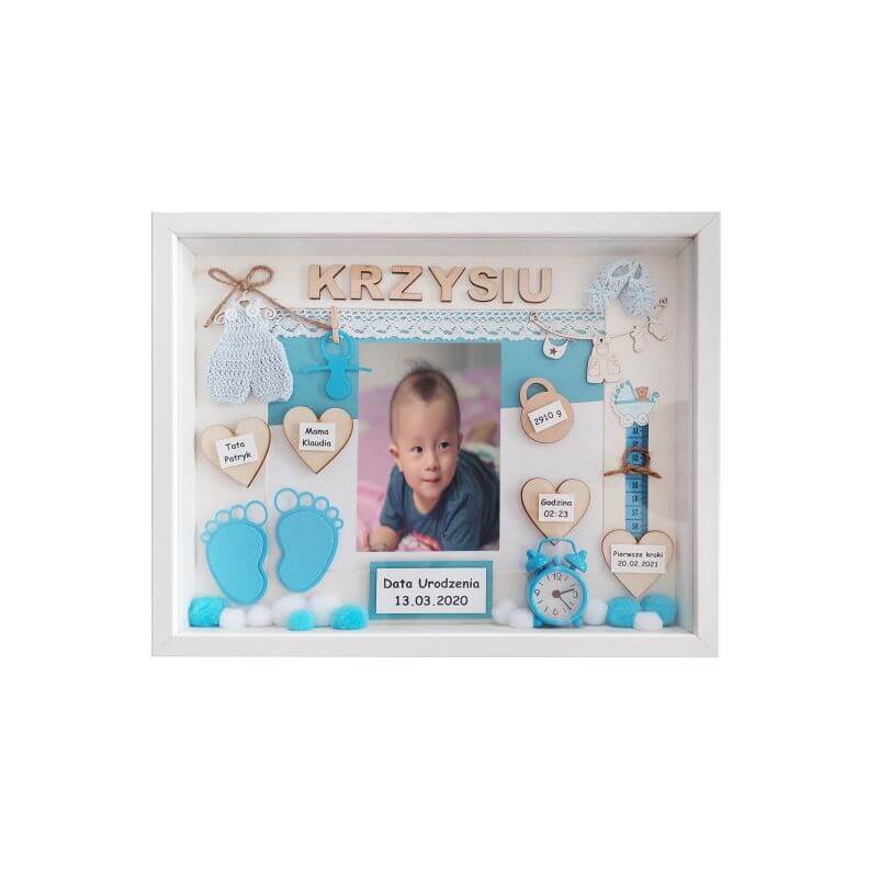 Personalizowana, ręcznie wykonana metryczka dla chłopca ze zdjęciem z okazji pierwszych urodzin w formie ramki 3D w rozmiarze 30×37 cm. Wzór dostępny także w rozmiarach: 30×30 cm.
