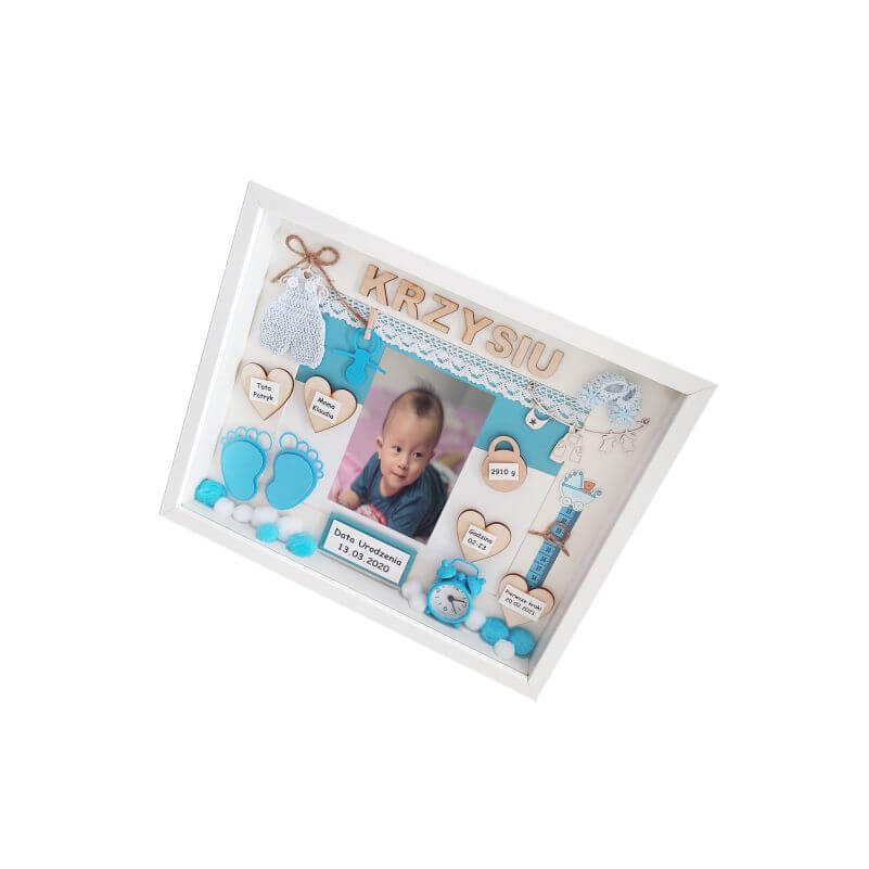 Przy zamówieniu należy podać podstawowe dane dziecka do umieszczenia widniejące w oferowanym wzorze m.in. imię, datę urodzenia, datę chrztu, wagę, wielkość, godzinę narodzin , miejscowość i inne. Każda ramka jest unikatowa i oryginalna dlatego na etapie zamówienia istnieje możliwość modyfikacji dodatków i umieszczenia innych, dodatkowych informacji takich jak np. imiona rodziców, imiona rodzeństwa, pierwszy uśmiech, pierwsze kroki, pierwszy ząbek, cytat, miejscowość, znak zodiaku i wiele innych.