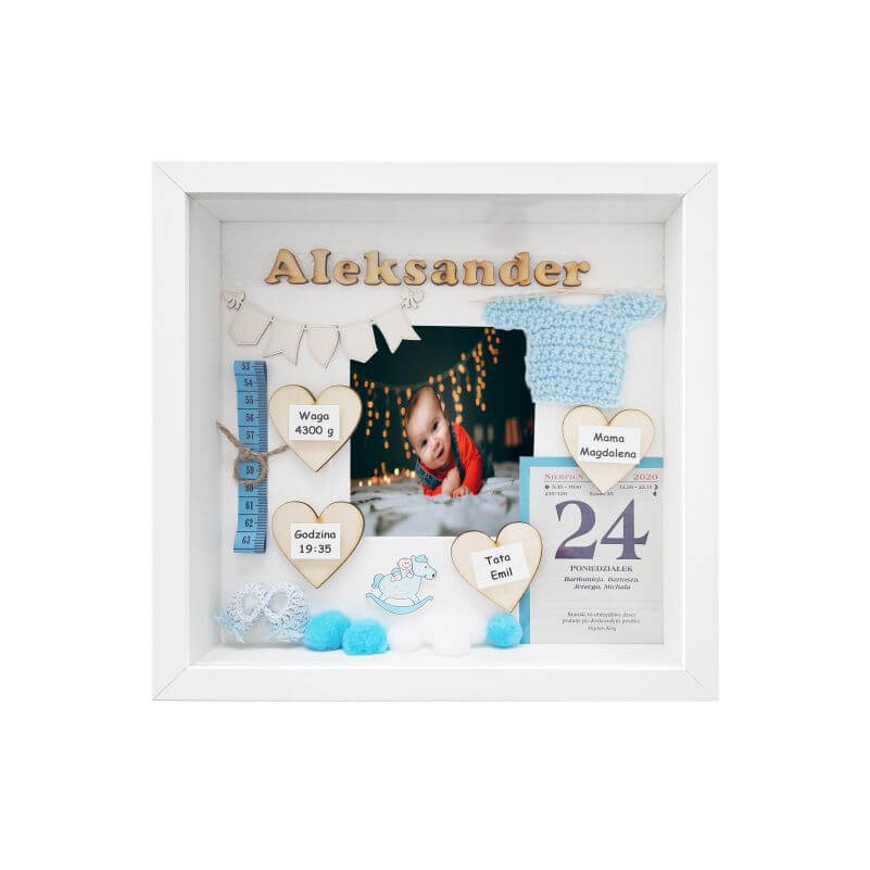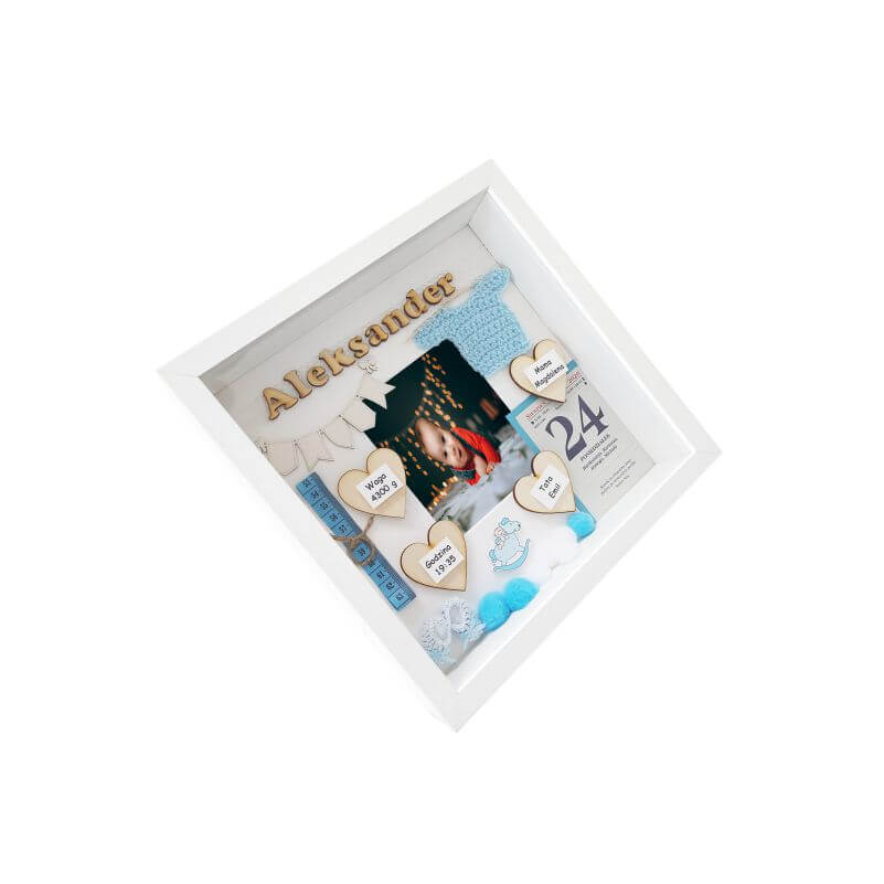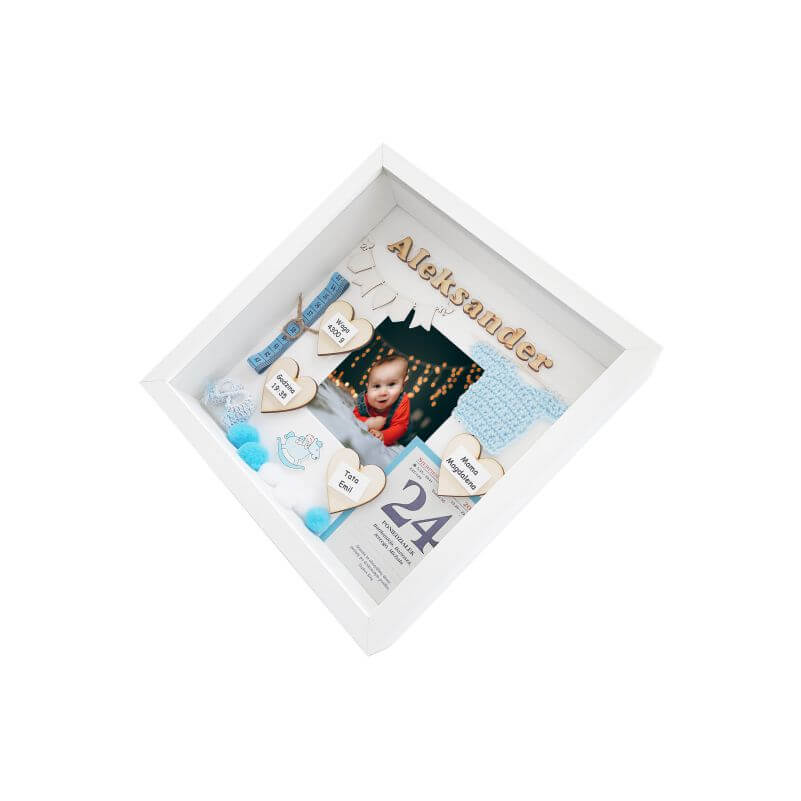 Oferowany wzór dotyczy metryczki 3D urodzenia chłopca ze zdjęciem w rozmiarze 27×27 cm. Ramka zdobiona między innymi takimi elementami jak: