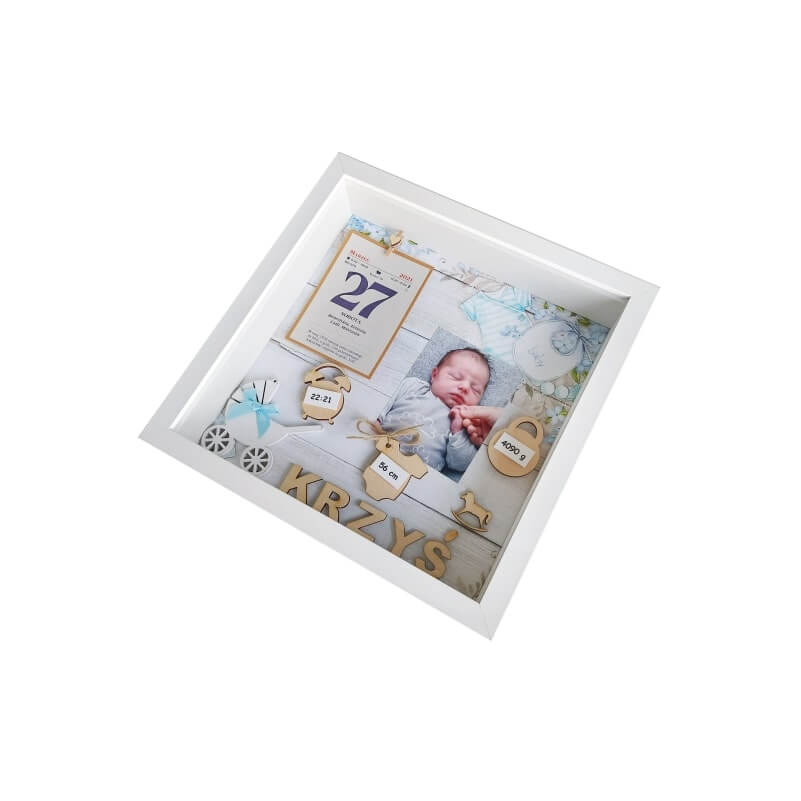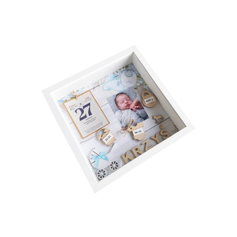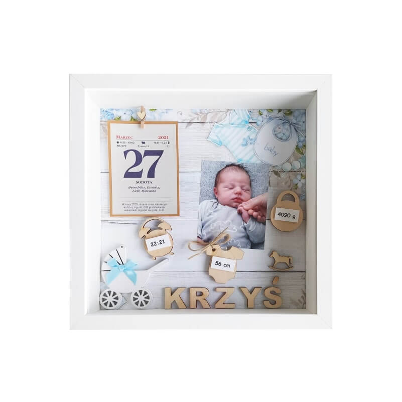 Oferowany wzór dotyczy metryczki 3D urodzenia chłopca ze zdjęciem w rozmiarze 27×27 cm. Ramka zdobiona między innymi takimi elementami jak: