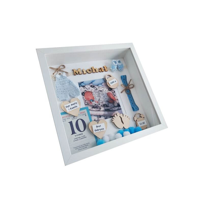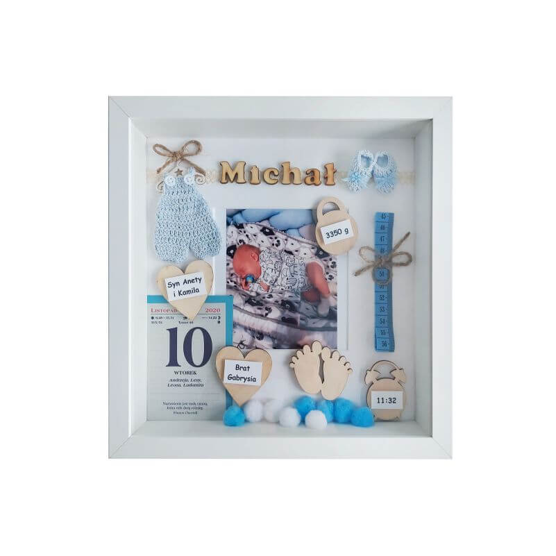 Metryczka urodzenia to wyjątkowa pamiątka na całe życie dla dziecka oraz rodziców. Idealny pomysł na prezent oraz oryginalna i niepowtarzalna ozdoba pokoju dziecięcego. Ręcznie wykonana, oprawiona w białej ramie z dekorami w efekcie 3D. Do postawienia lub powieszenia na ścianie. Kolorystyka i dodatki dobrane do płci dziecka. Zastosowane dekory wykonane są z wysokogatunkowych materiałów: drewna, papieru, tkanin i innych.