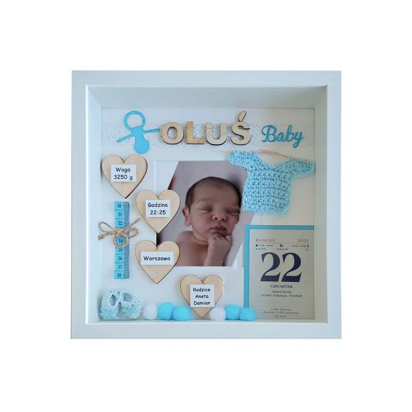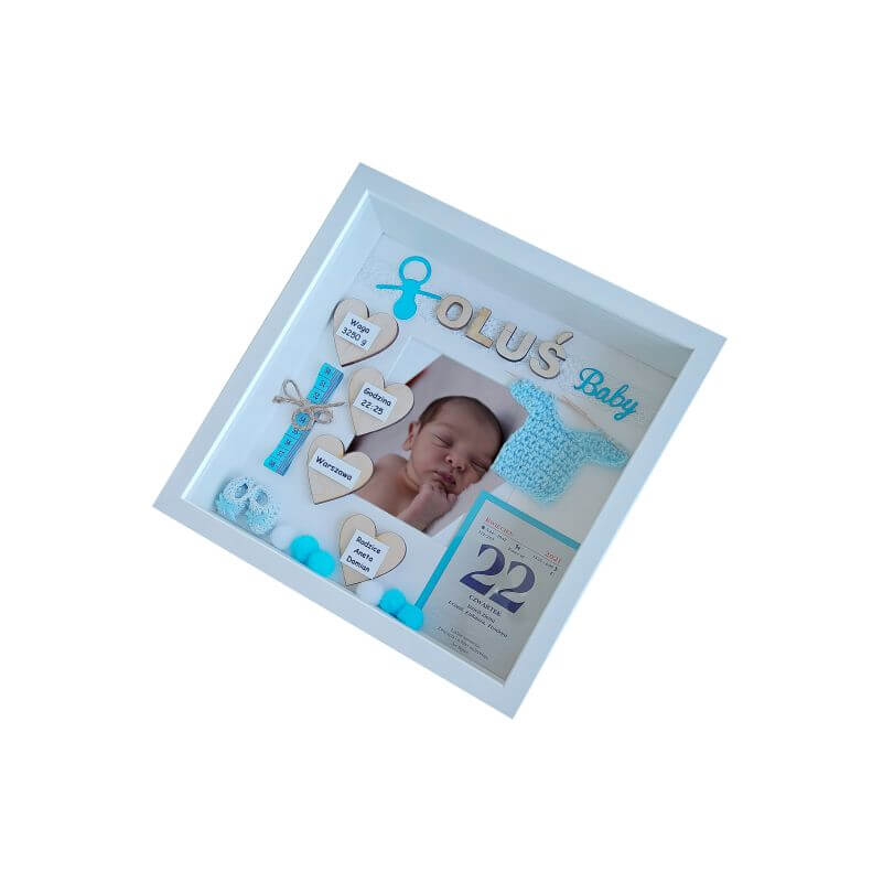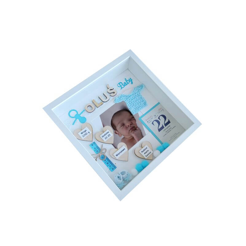 Oferowany wzór dotyczy metryczki 3D urodzenia chłopca ze zdjęciem w rozmiarze 27×27 cm z osłoną pleksi. Ramka zdobiona między innymi takimi elementami jak:
