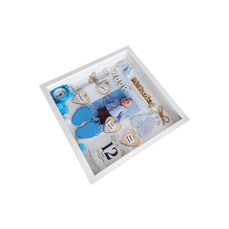 Oferowany wzór dotyczy metryczki 3D urodzenia dla chłopca ze zdjęciem w rozmiarze 30×30 cm. Ramka zdobiona między innymi takimi elementami jak: