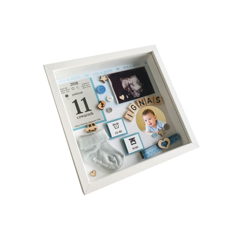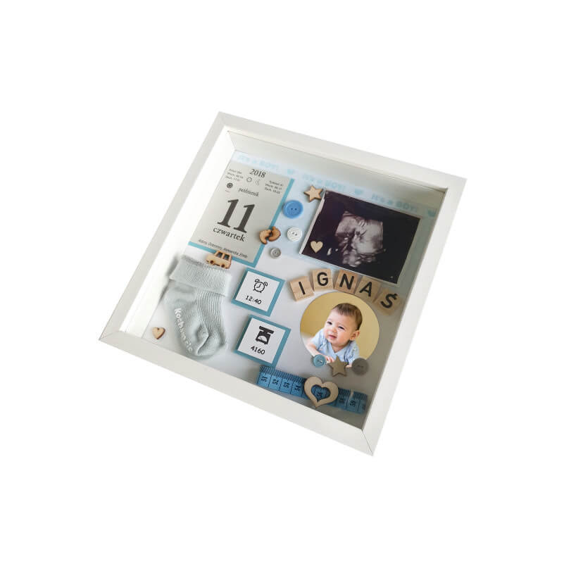 Personalizowana, ręcznie wykonana metryczka dla chłopca ze zdjęciem z okazji narodzin w formie ramki 3D w rozmiarze 25×25 cm. Wzór dostępny także w rozmiarach: 27×27 cm, 30×30 cm.