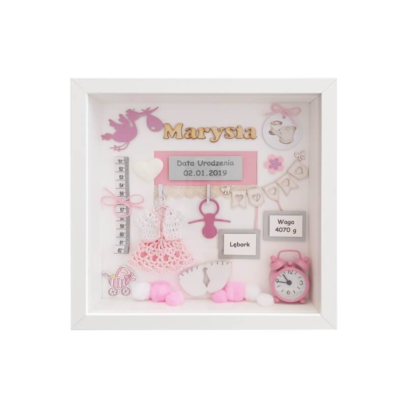 Metryczka urodzenia to wyjątkowa pamiątka na całe życie dla dziecka oraz rodziców. Idealny pomysł na prezent oraz oryginalna i niepowtarzalna ozdoba pokoju dziecięcego. Ręcznie wykonana, oprawiona w białej ramie z dekorami w efekcie 3D. Do postawienia lub powieszenia na ścianie. Kolorystyka i dodatki dobrane do płci dziecka. Zastosowane dekory wykonane są z wysokogatunkowych materiałów: drewna, papieru, tkanin i innych.