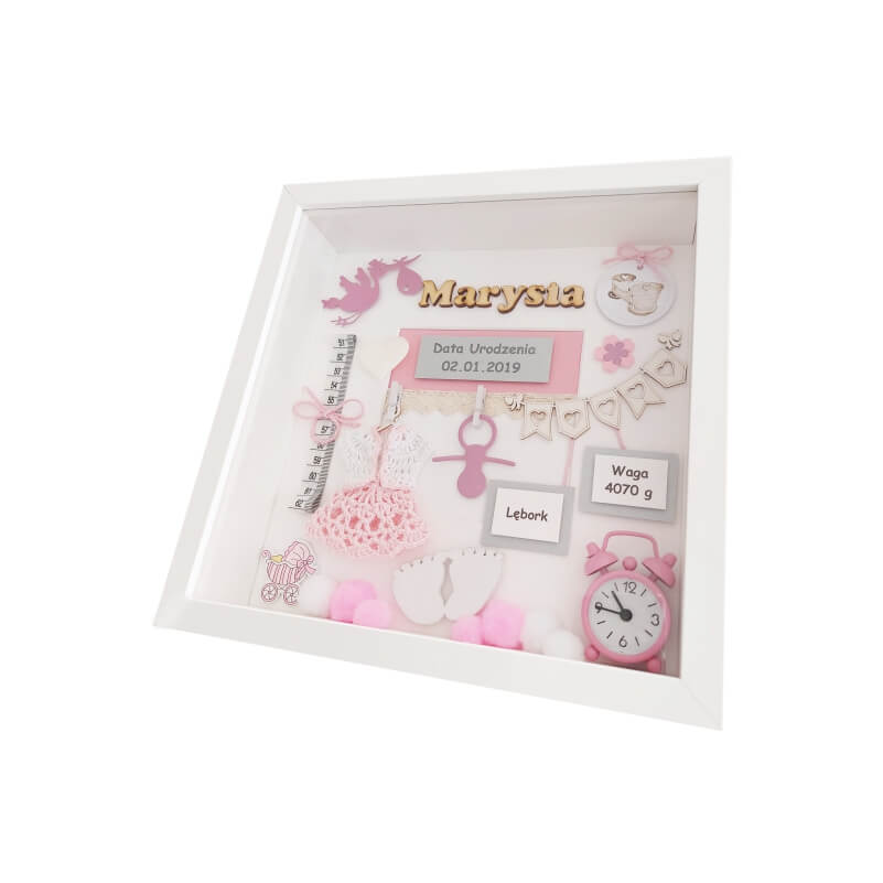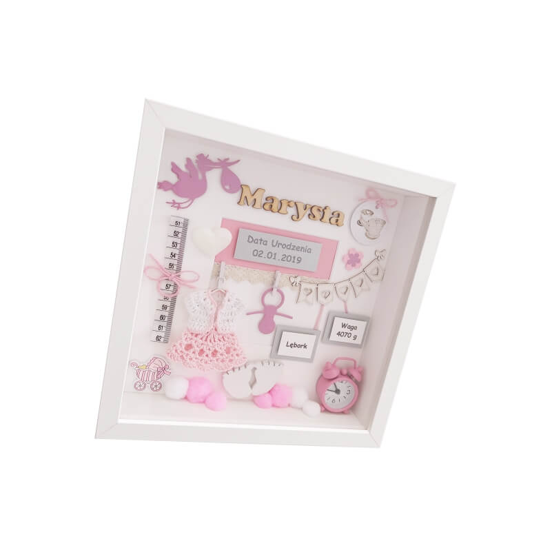 Personalizowana, ręcznie wykonana metryczka dla dziewczynki bez zdjęcia z okazji narodzin w formie ramki 3D w rozmiarze 27×27 cm. Wzór dostępny także w rozmiarach: 25×25 cm, 30×30 cm.
