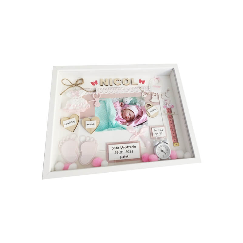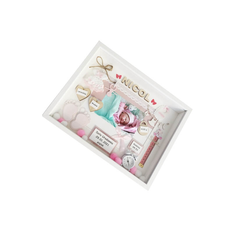 Oferowany wzór dotyczy metryczki 3D urodzenia dla dziewczynki ze zdjęciem w rozmiarze 30×37 cm. Ramka zdobiona między innymi takimi elementami jak: