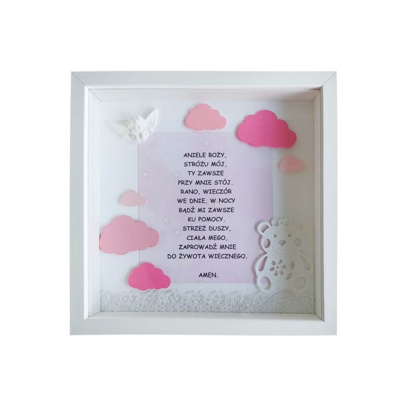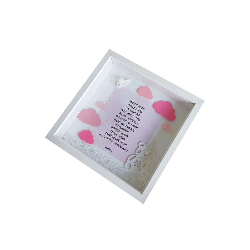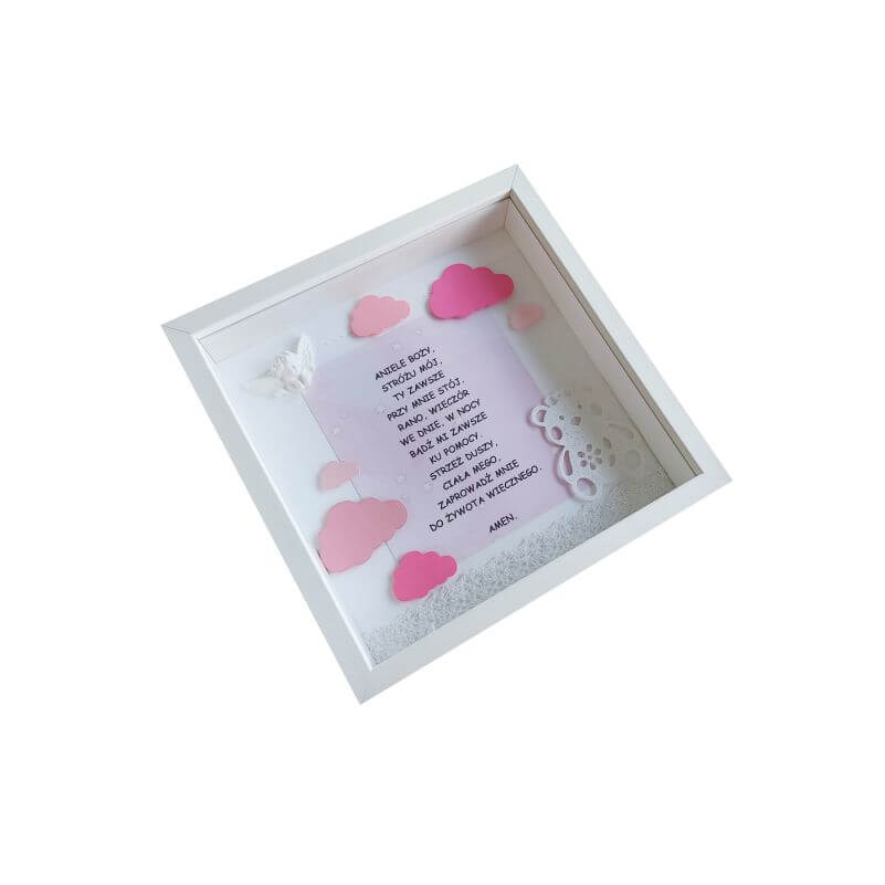Oferowany wzór dotyczy modlitwy w ramce 3D dla dziewczynki w rozmiarze 25×25 cm ze szklaną osłoną. Ramka zdobiona między innymi takimi elementami jak: