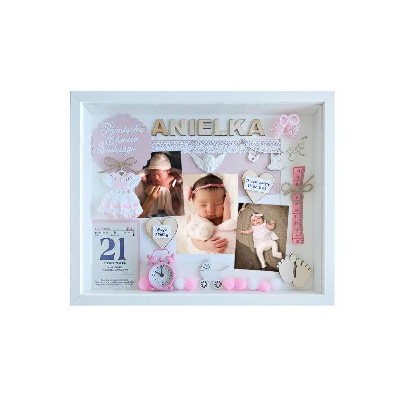 Oferowany wzór dotyczy metryczki 3D na chrzest dla dziewczynki ze zdjęciem w rozmiarze 30×37 cm. Ramka zdobiona między innymi takimi elementami jak: