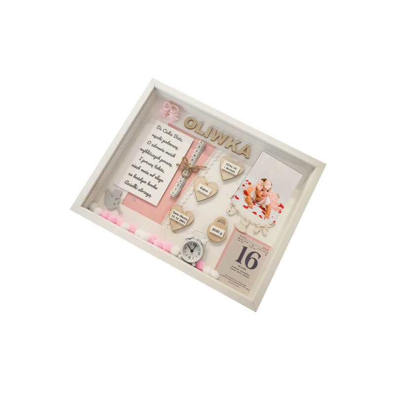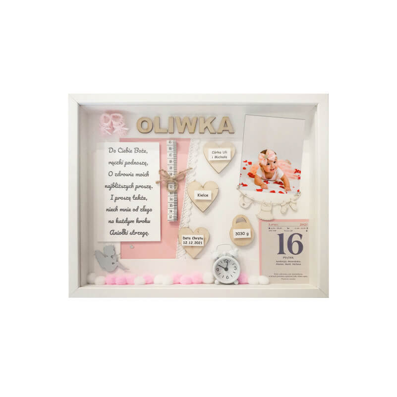 Przy zamówieniu należy podać podstawowe dane dziecka do umieszczenia widniejące w oferowanym wzorze m.in. imię, datę urodzenia, datę chrztu, wagę, wielkość, godzinę narodzin , miejscowość i inne. Każda ramka jest unikatowa i oryginalna dlatego na etapie zamówienia istnieje możliwość modyfikacji dodatków i umieszczenia innych, dodatkowych informacji takich jak np. imiona rodziców, imiona rodzeństwa, pierwszy uśmiech, pierwsze kroki, pierwszy ząbek, cytat, miejscowość, znak zodiaku i wiele innych.