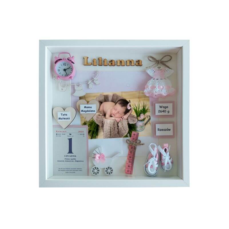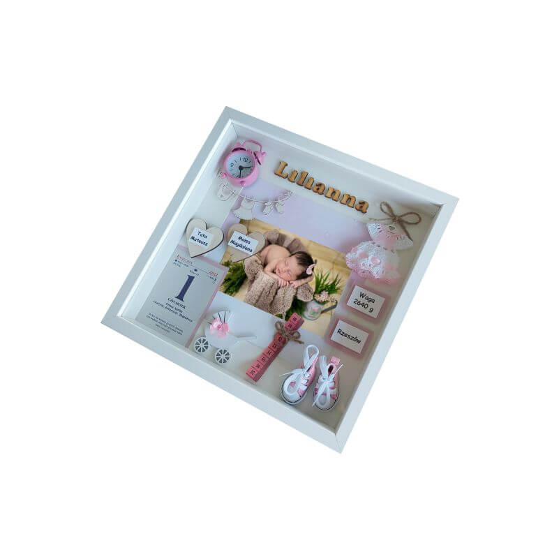 Oferowany wzór dotyczy metryczki 3D urodzenia dla dziewczynki ze zdjęciem w rozmiarze 30×30 cm. Ramka zdobiona między innymi takimi elementami jak: